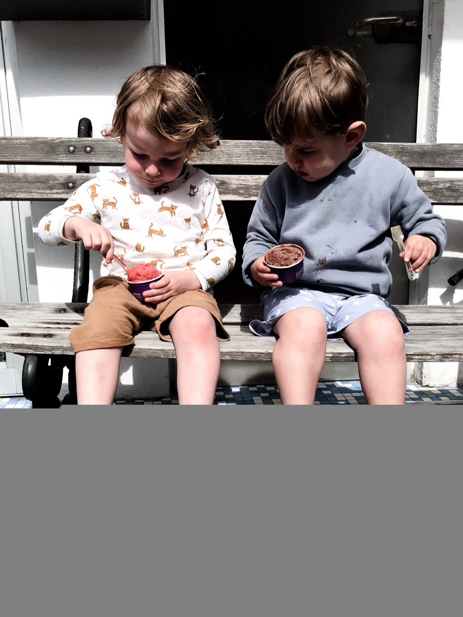 Pour le goûter, l’heure était aux glaces de l’excellent maître artisan La Cour d’Orgères. Des petits pots pour les enfants et moi après beaucoup d’hésitation – tant tous les parfums donnent envie – j’ai choisi une boule pistache.
